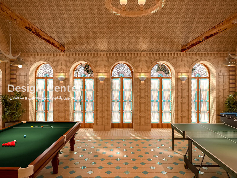 حیاط این ویلا، فضایی برای تعامل اجتماعی و ارتباط با طبیعت فراهم میآورد. طراحی حیاط با استفاده از گیاهان بومی و آبنما وفضای ورزشی، محیطی سرشار از آرامش و سکون ایجاد میکند. نورپردازی طبیعی از طریق ارسیهای زیبا با شیشههای رنگی، تجربهای جادویی را در طول روز و شب برای ساکنان فراهم میآورد و حس پیوند عمیق با محیط را تقویت میکند.