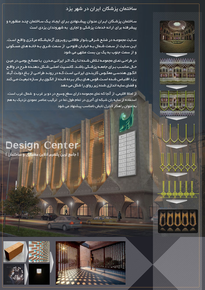 ساختمان پزشکان یزد، با الهام از معماری سنتی ایران و در نظر گرفتن نیازهای مدرن شهری طراحی شده است. این پروژه با هدف ایجاد فضایی مناسب برای تعاملات حرفهای پزشکان و همچنین ارائه محیطی آرامشبخش و مناسب برای مراجعین، با دقت و حساسیت بالایی به اجرا درآمده است.